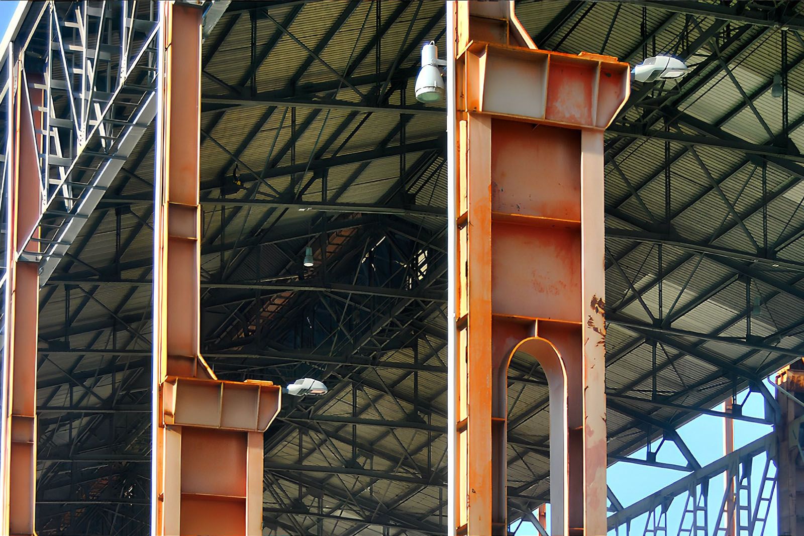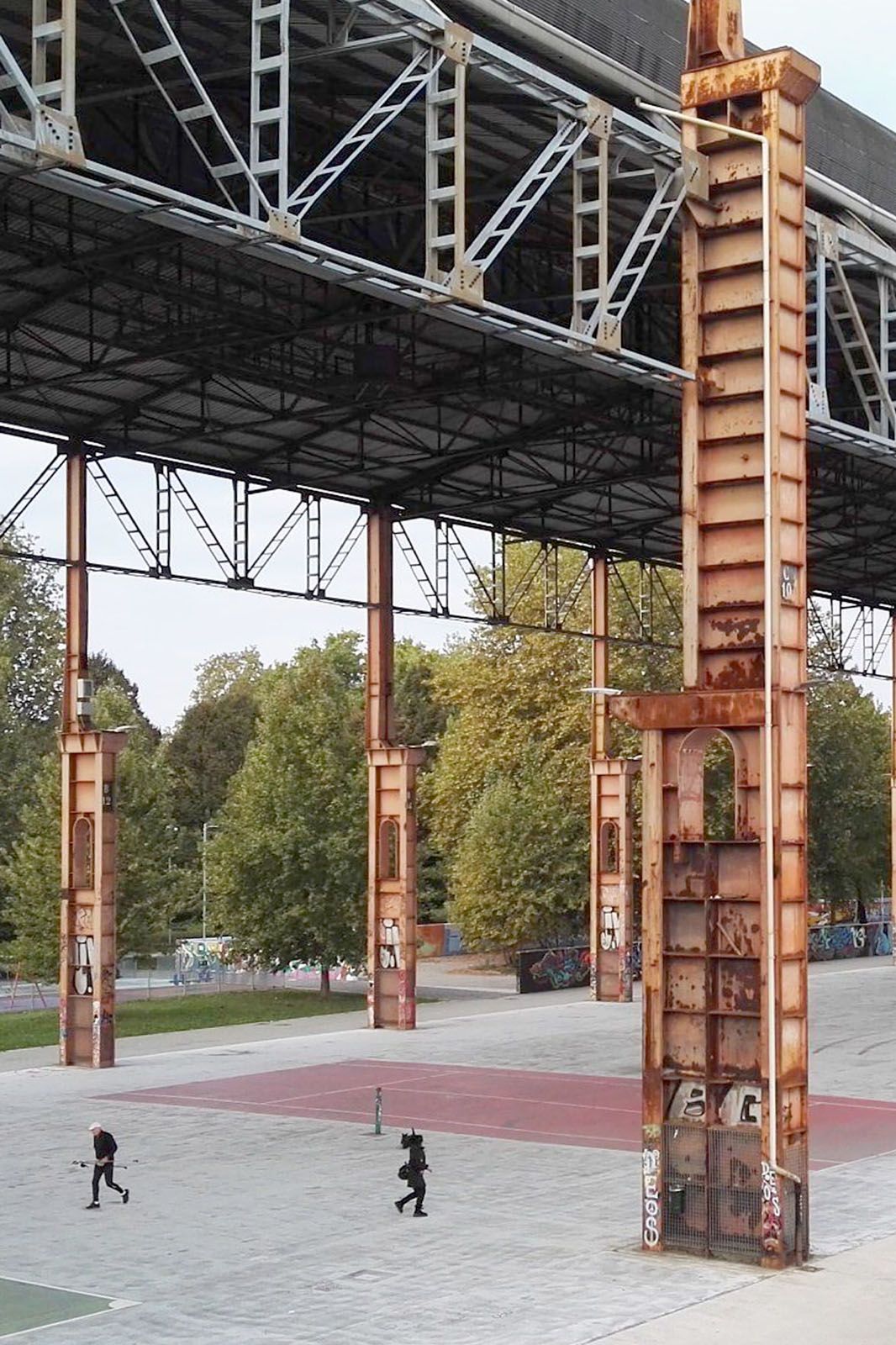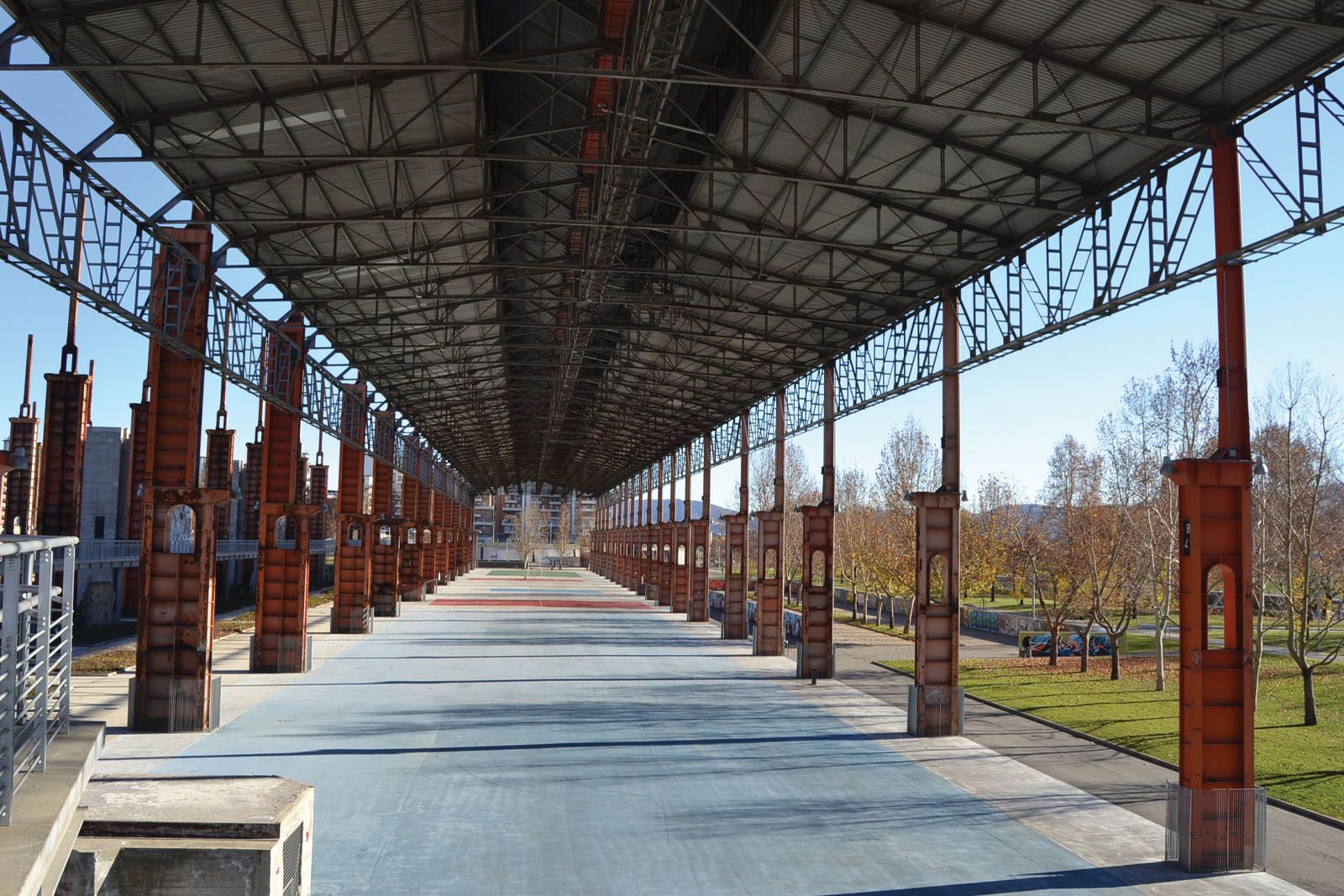 In particolare, in quest’area persiste lo scheletro del vecchio capannone dello strippaggio i cui pilastri d’acciaio, alti circa 30 m, racchiudono scenograficamente un luogo multifunzionale contornato da aiuole e dotato di una pedana sopraelevata che lo collega con il lotto adiacente. Led colorati diffusi e giardini acquatici ricavati dalle tre vasche di decantazione contribuisco a conferire al luogo un fascino unico e identitario.