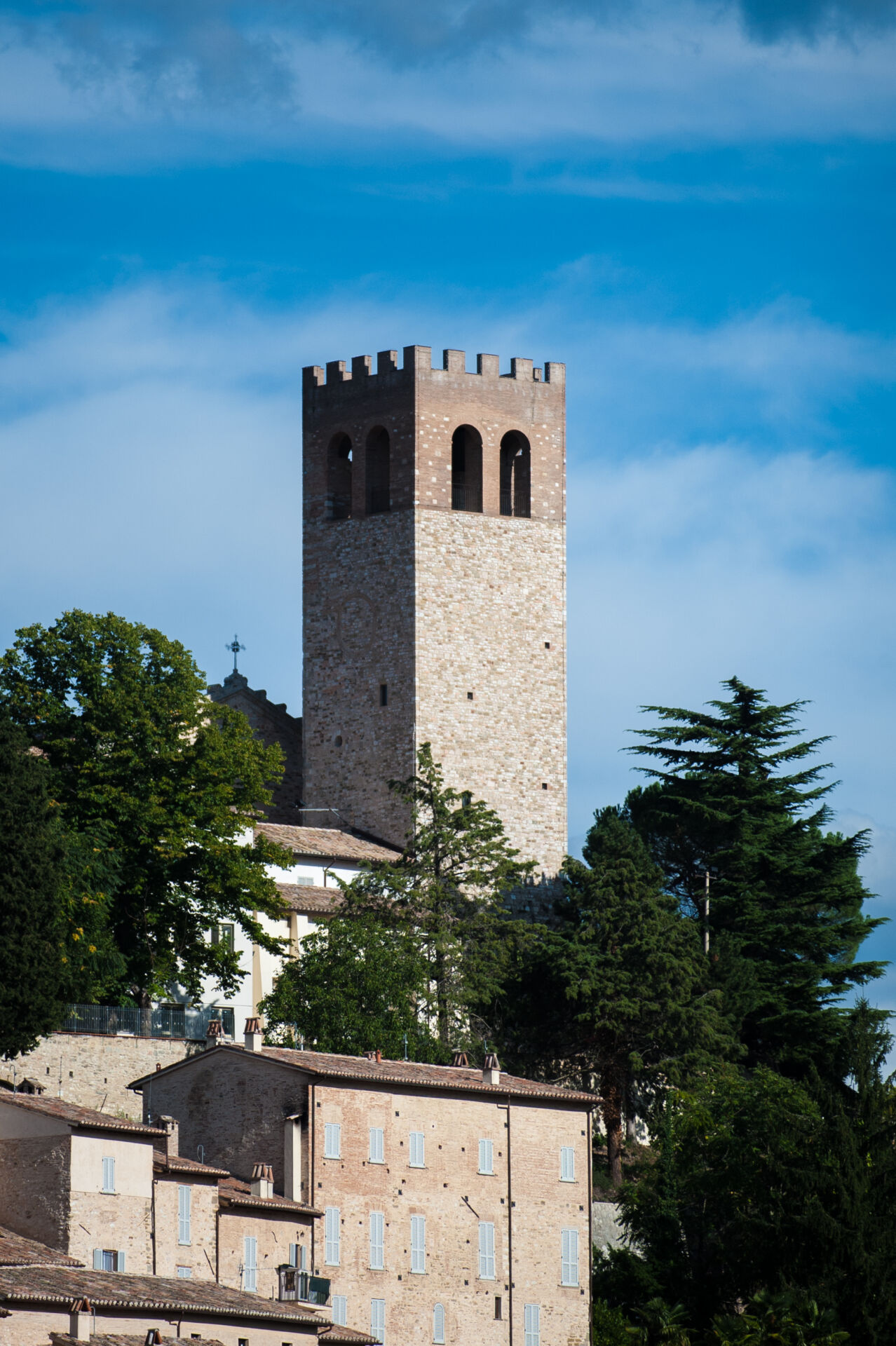 Il cosiddetto “Campanaccio” è un torrione di 30 m di altezza, risalente al sec. XI, che si eleva sulla sommità del colle su cui è stato edificato il centro storico di Nocera Umbra. Il basamento della torre è costituito da conci di pietra, mentre il resto è in muratura a secco con paramento esterno in opera mista. I solai sono costituiti da volte a botte in pietra.